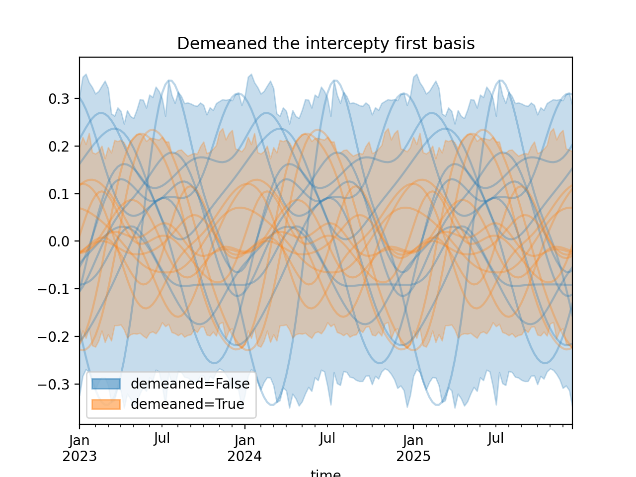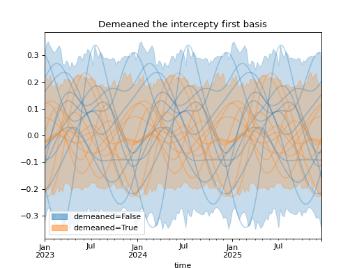 import numpy as np import pandas as pd import xarray as xr import matplotlib.pyplot as plt from pymc_marketing.mmm import HSGPPeriodic from pymc_marketing.plot import plot_curve seed = sum(map(ord, "Periodic GP")) rng = np.random.default_rng(seed) scale = 0.25 ls = 1 kwargs = dict(ls=ls, scale=scale, period=52, cov_func="periodic", dims="time", m=20) n = 52 * 3 dates = pd.date_range("2023-01-01", periods=n, freq="W-MON") X = np.arange(n) coords = {"time": dates} hsgp = HSGPPeriodic(demeaned_basis=False, **kwargs).register_data(X) hsgp_demeaned = HSGPPeriodic(demeaned_basis=True, **kwargs).register_data(X) def sample_curve(hsgp): return hsgp.sample_prior(coords=coords, random_seed=rng)["f"] non_demeaned = sample_curve(hsgp).rename("False") demeaned = sample_curve(hsgp_demeaned).rename("True") combined = xr.merge([non_demeaned, demeaned]).to_array("demeaned") _, axes = combined.pipe(plot_curve, "time", same_axes=True) axes[0].set(title="Demeaned the intercepty first basis") plt.show()