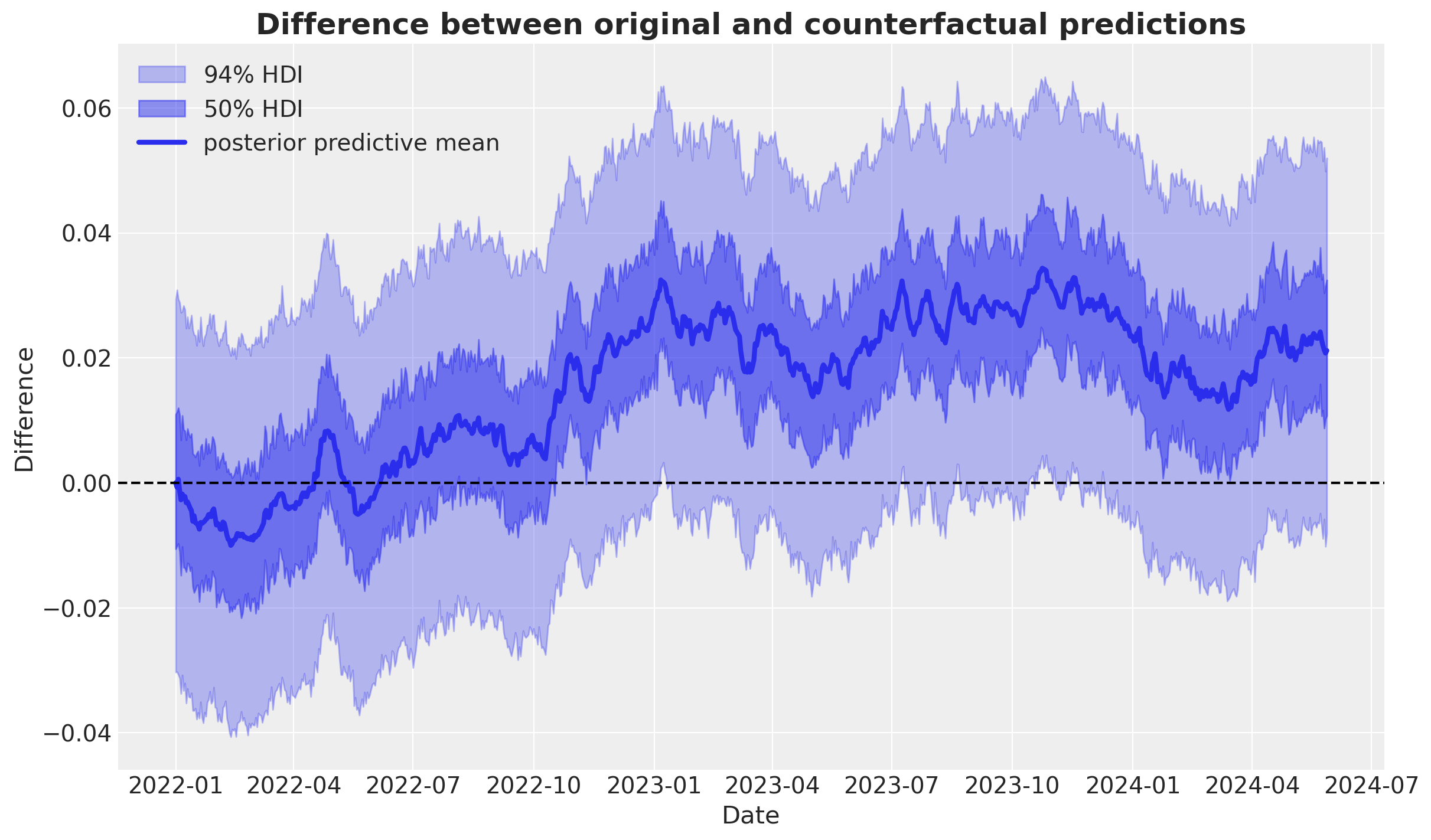 As expected, on average most of the predicted impressions under the counterfactual are lower than the original predictions.